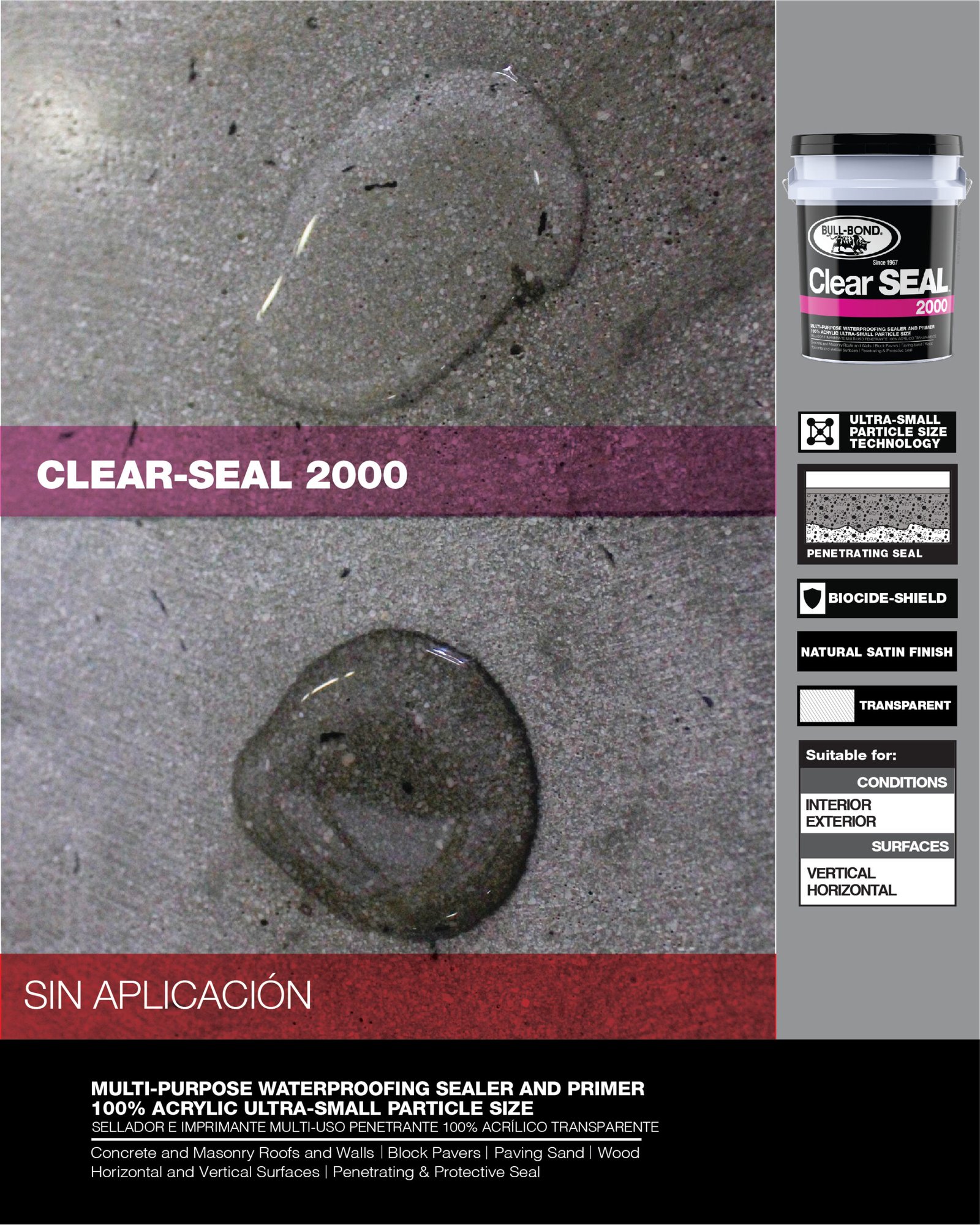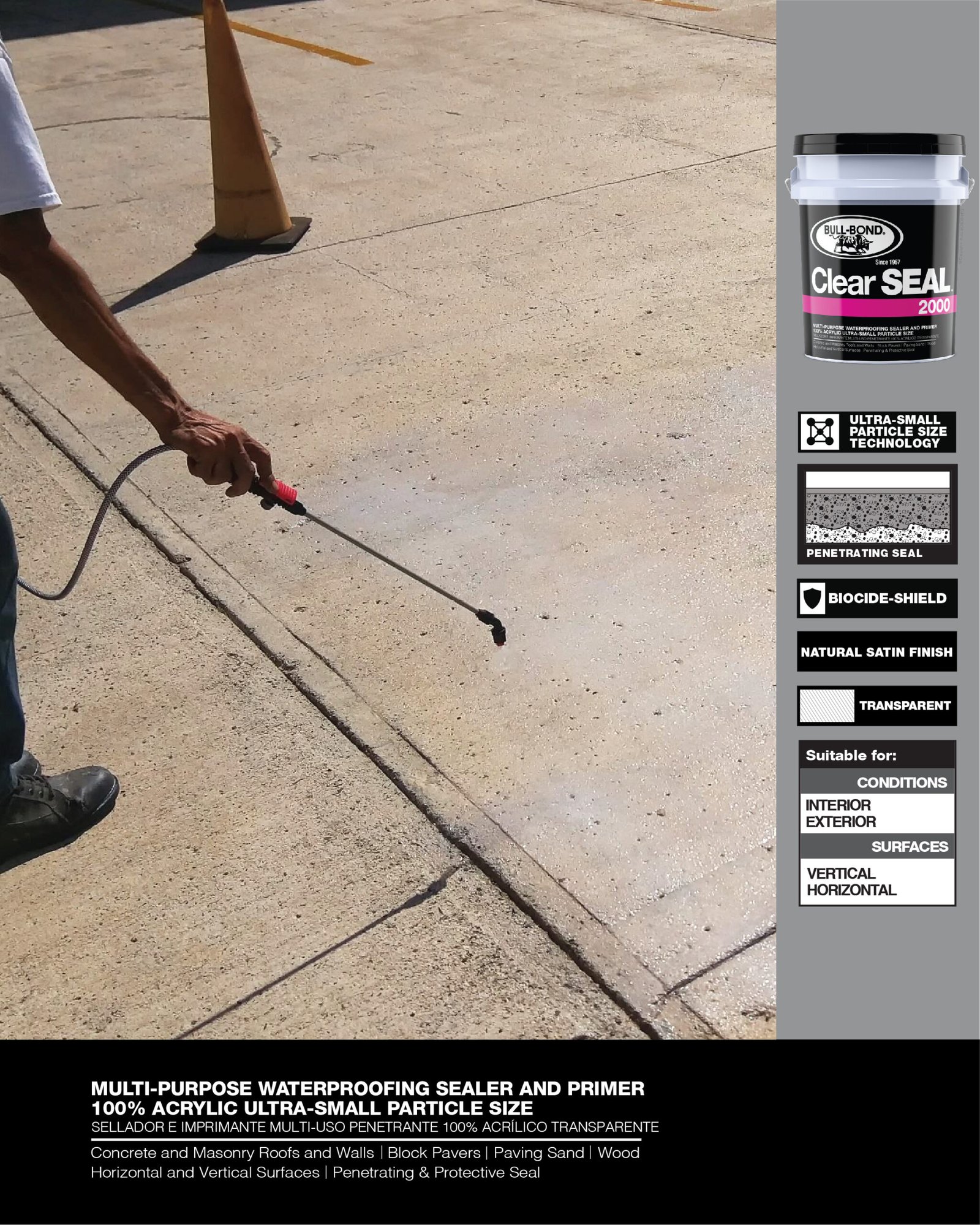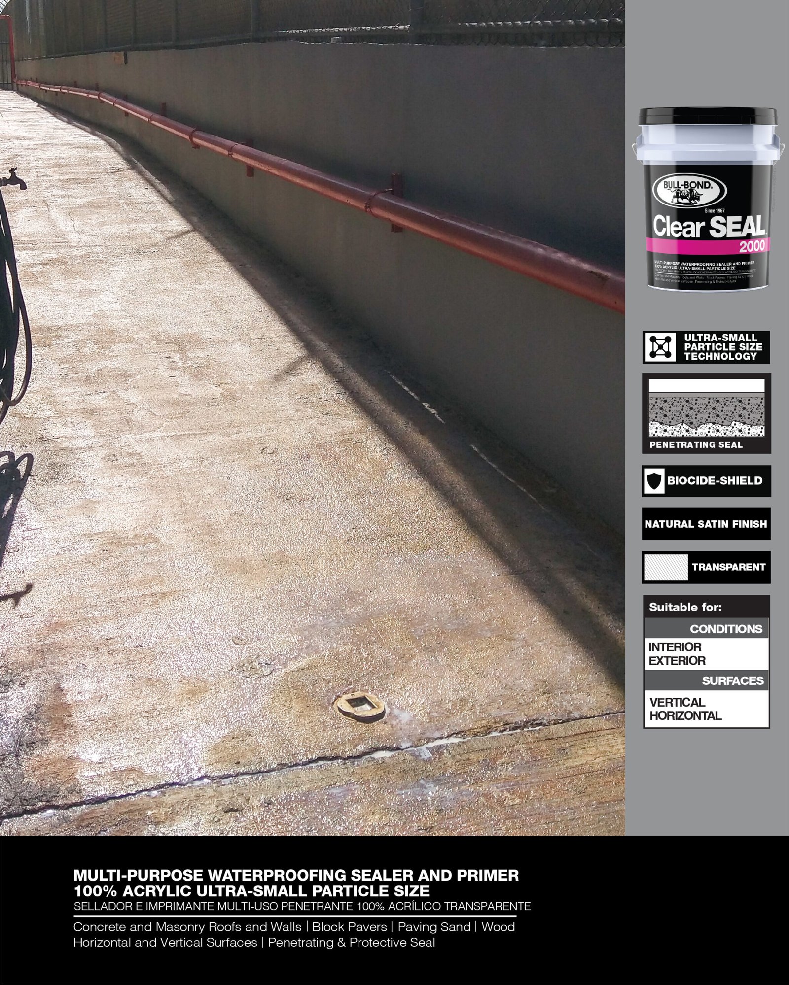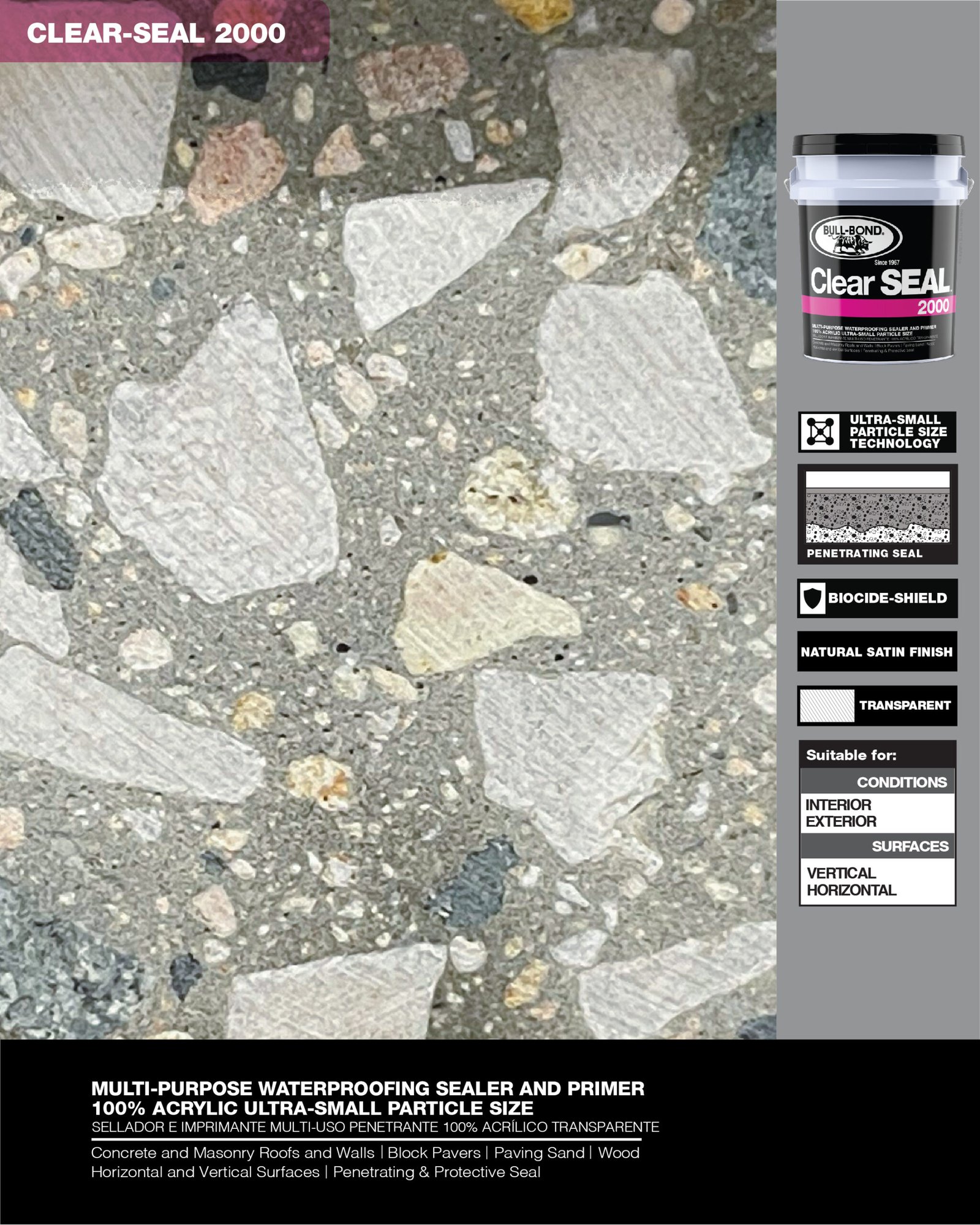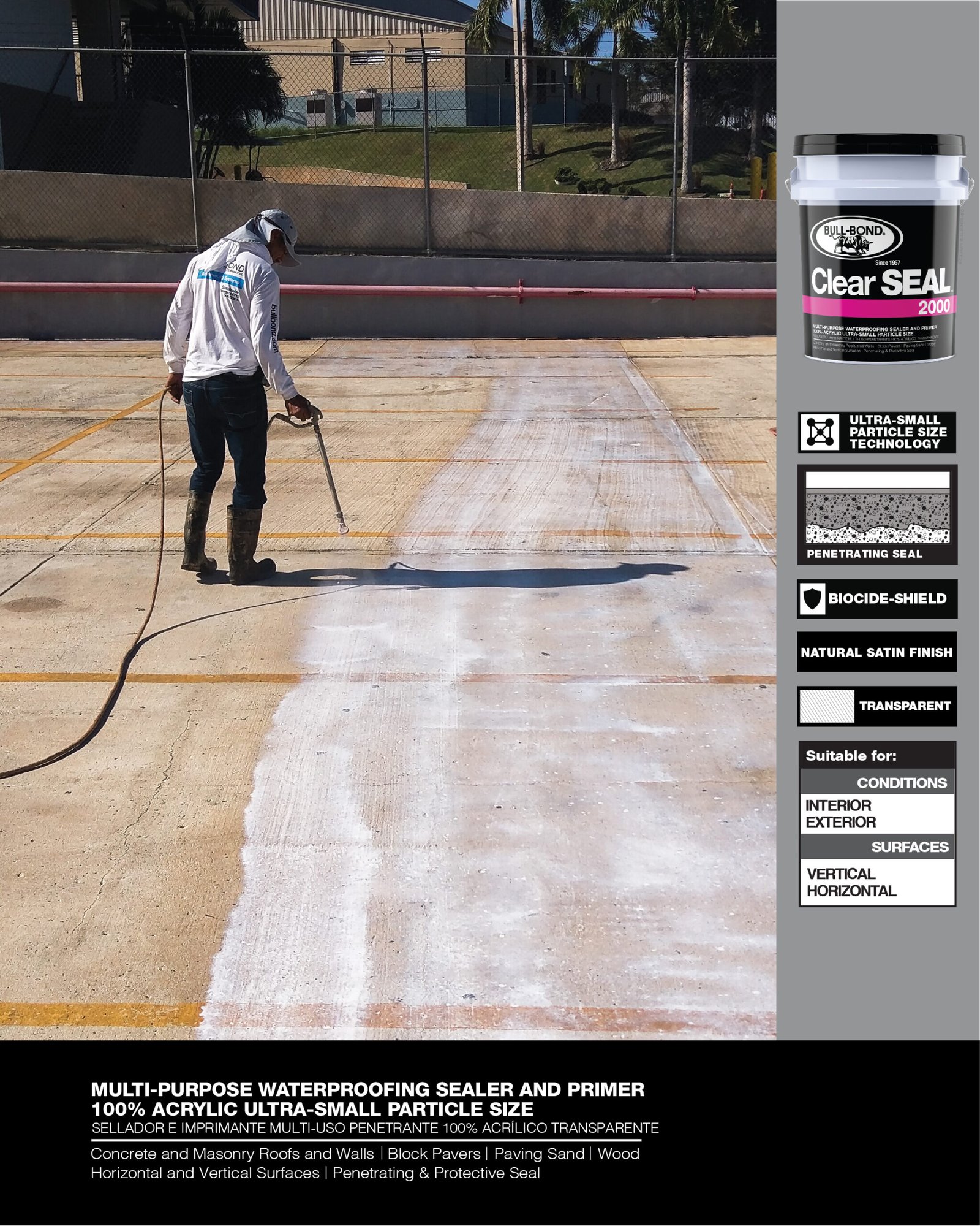 CLEAR SEAL 2000™ es un sellador e imprimante penetrante, transparente, 100% acrílico a base de agua. Este producto multi-uso fue especialmente diseñado para producir un sellado protector que penetra en las superficies porosas de concreto, albañilería y madera. CLEAR SEAL 2000™ reduce la permeabilidad, disminuye el crecimiento de moho y hongo, encapsula superficies polvorosas y entrelaza arena de junta para bloques de pavimento. CLEAR SEAL 2000™ se puede utilizar por si solo como sellador de acabado natural satín o como un imprimante de impermeabilización y encapsulador de polvo antes de la aplicación de pinturas y selladores elastoméricos en paredes y techos.
