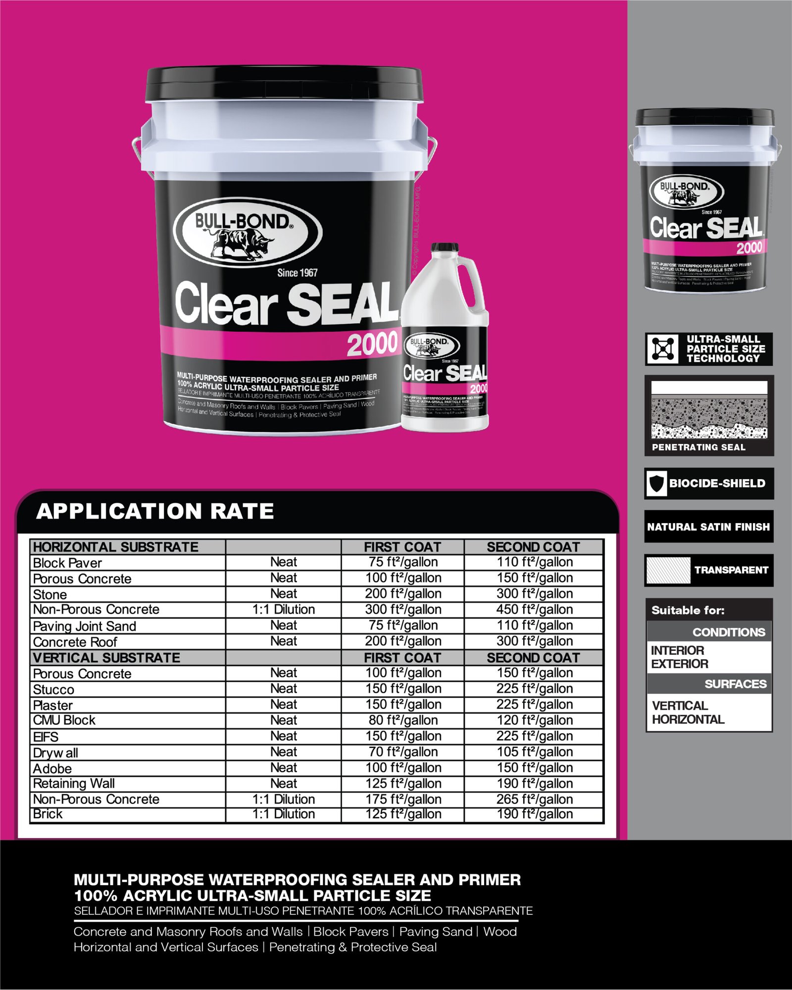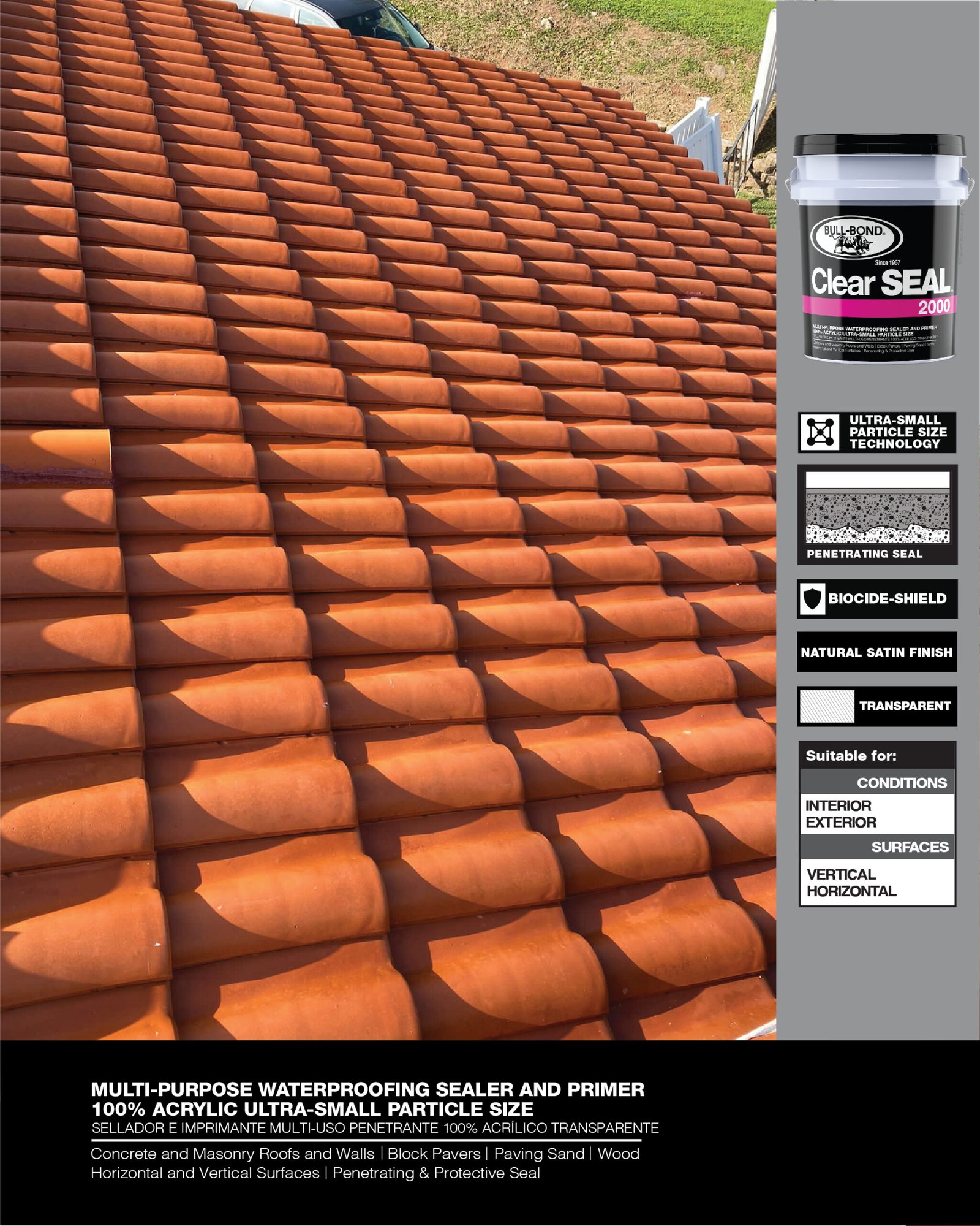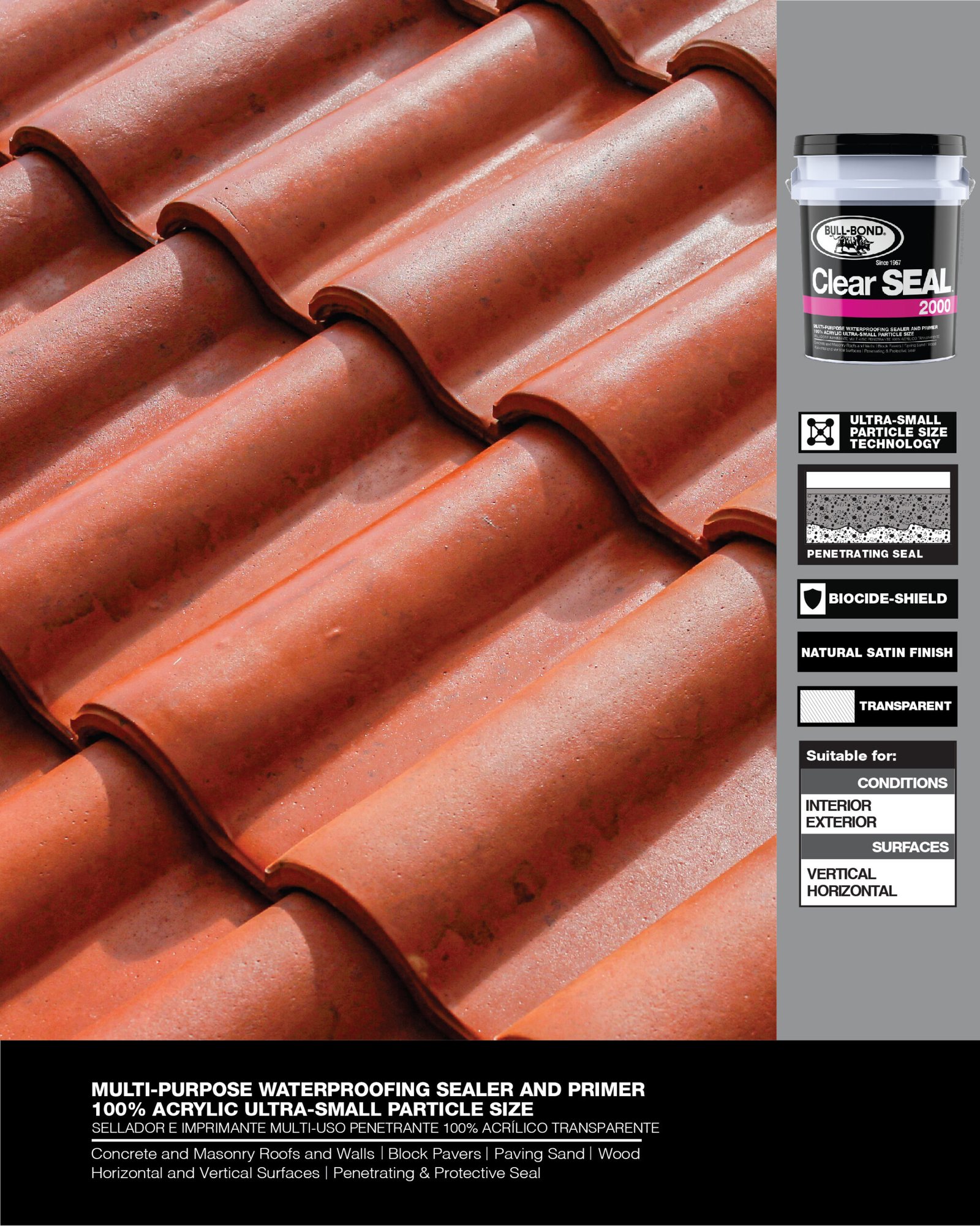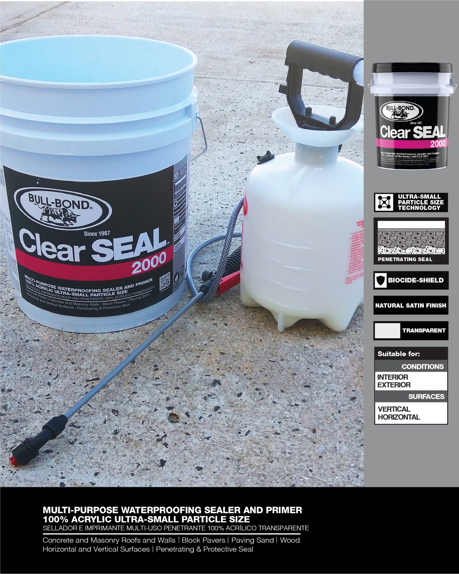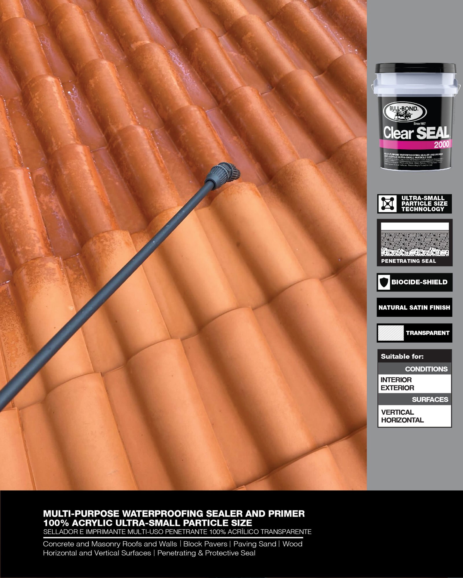 CLEAR SEAL 2000™ es un sellador e imprimante penetrante, transparente, 100% acrílico a base de agua. Este producto multi-uso fue especialmente diseñado para producir un sellado protector que penetra en las superficies porosas de concreto, albañilería y madera. CLEAR SEAL 2000™ reduce la permeabilidad, disminuye el crecimiento de moho y hongo, encapsula superficies polvorosas y entrelaza arena de junta para bloques de pavimento. CLEAR SEAL 2000™ se puede utilizar por si solo como sellador de acabado natural satín o como un imprimante de impermeabilización y encapsulador de polvo antes de la aplicación de pinturas y selladores elastoméricos en paredes y techos.