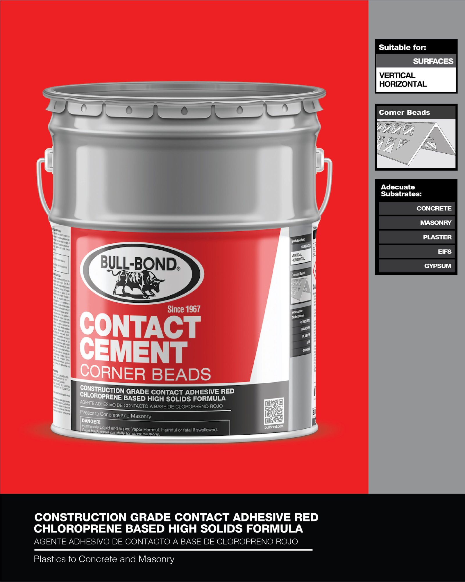 An advanced, high yield, red colored, construction contact adhesive based on polychloroprene specially designed for the instant and permanent bonding of plastic corner beads and PVC stucco accessories to concrete, masonry, plaster and other porous construction materials.