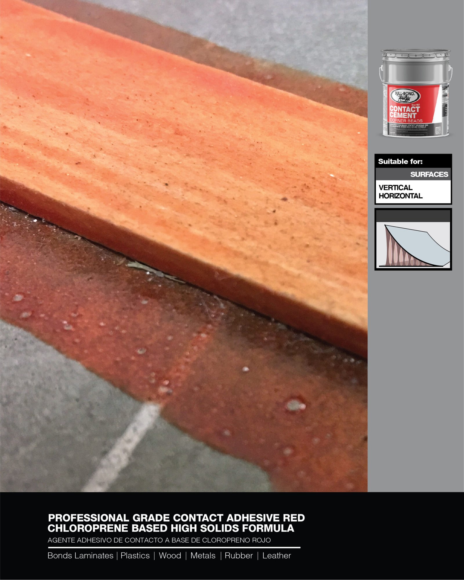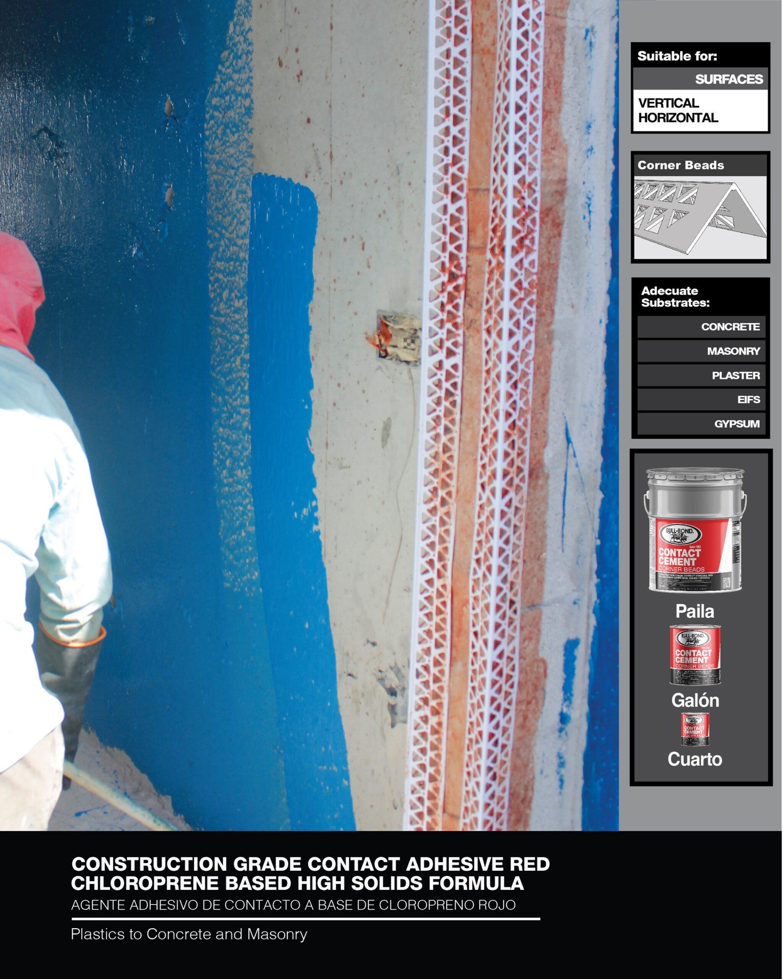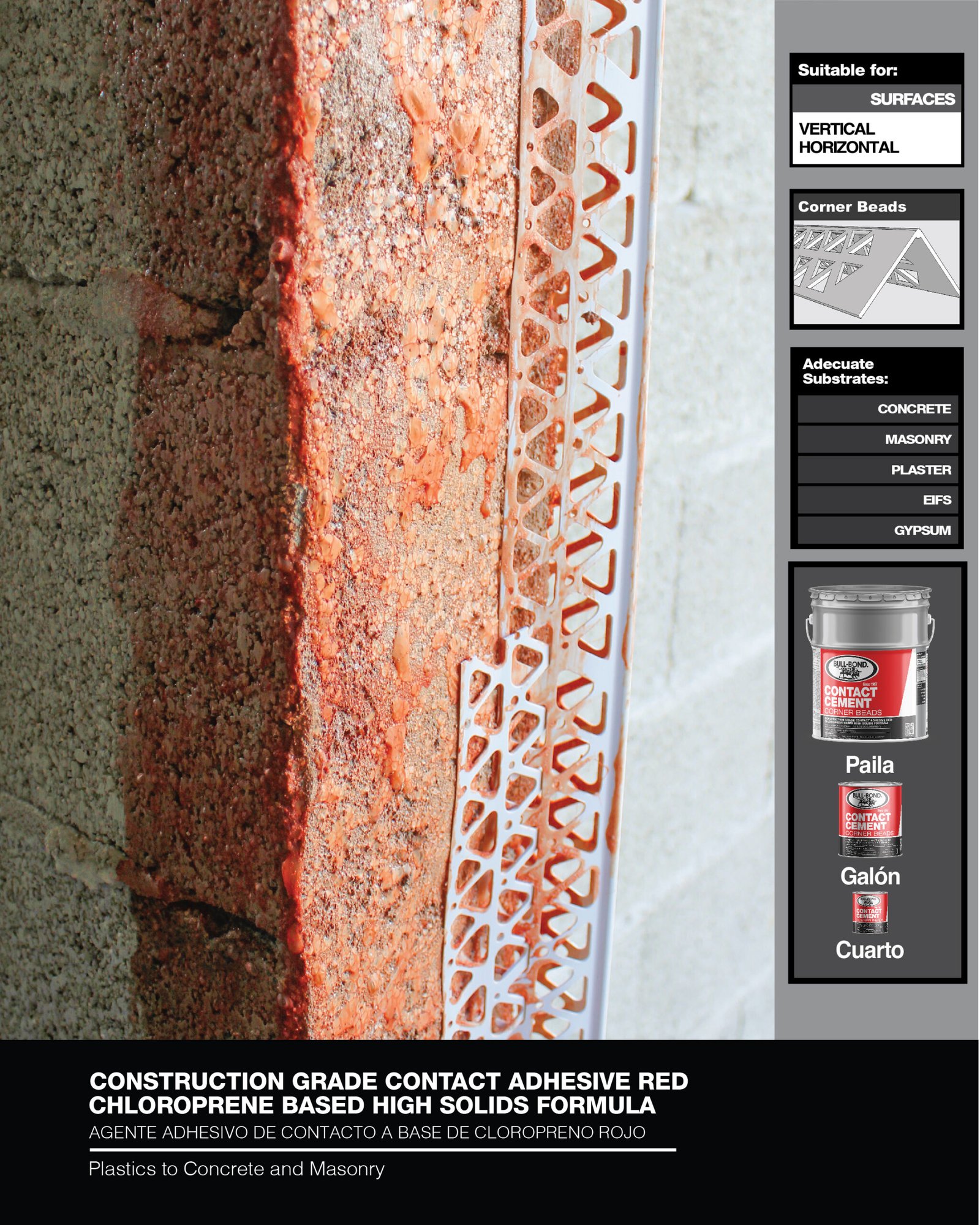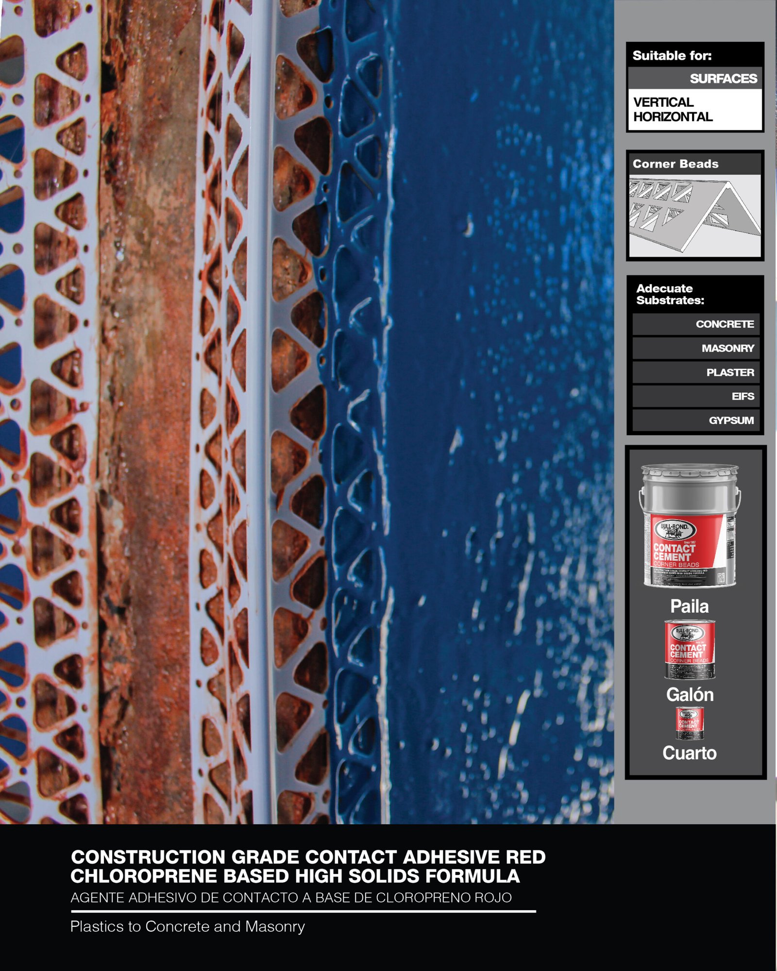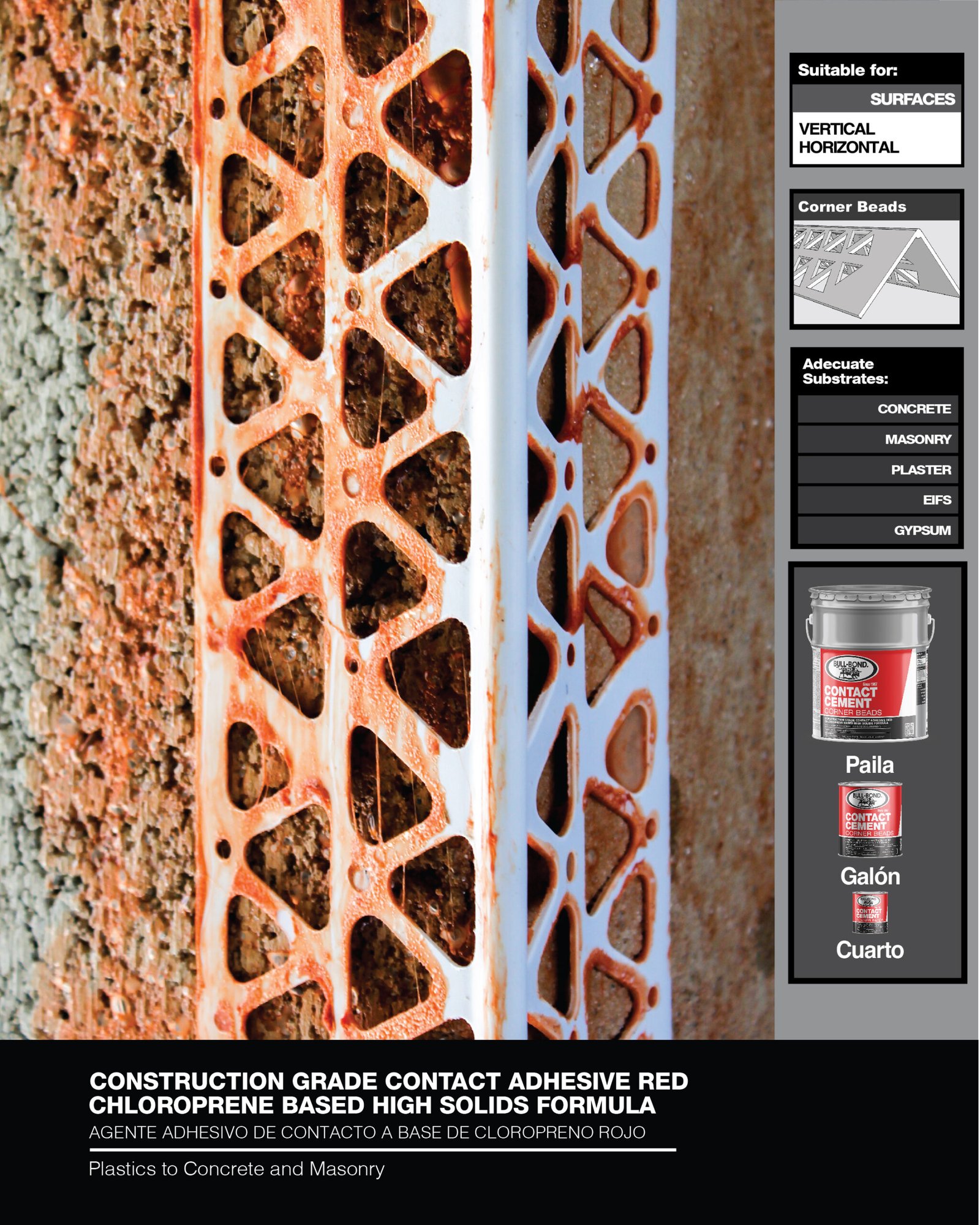 Un adhesivo de contacto para construcción avanzado, de alto rendimiento, de color rojo, a base de policloropreno, especialmente diseñado para la unión instantánea y permanente de esquineros plásticos y accesorios de estuco de PVC a concreto, mampostería, yeso y otros materiales de construcción porosos.