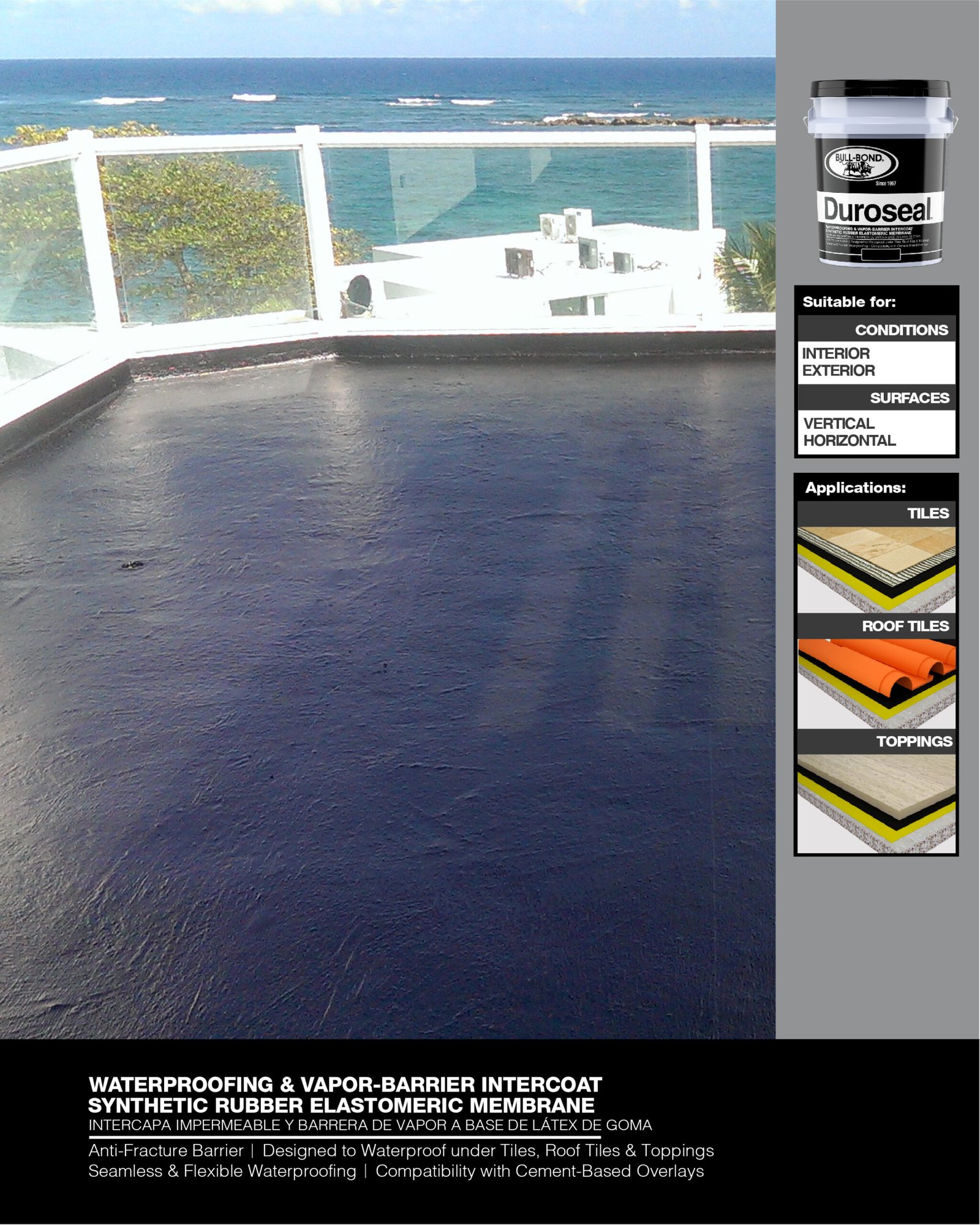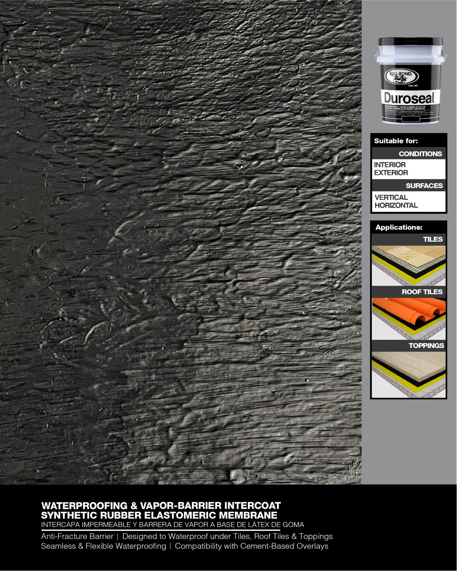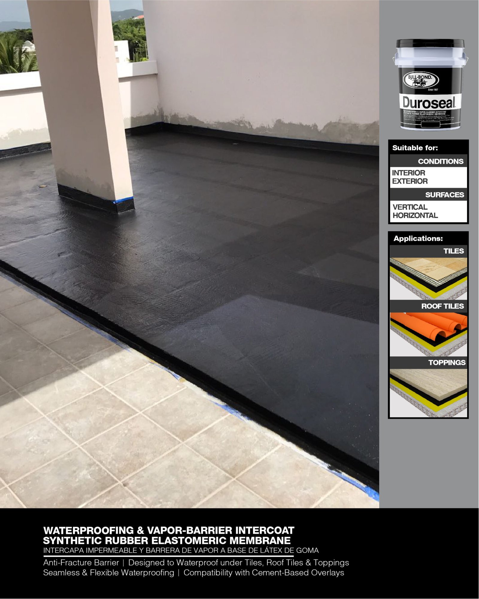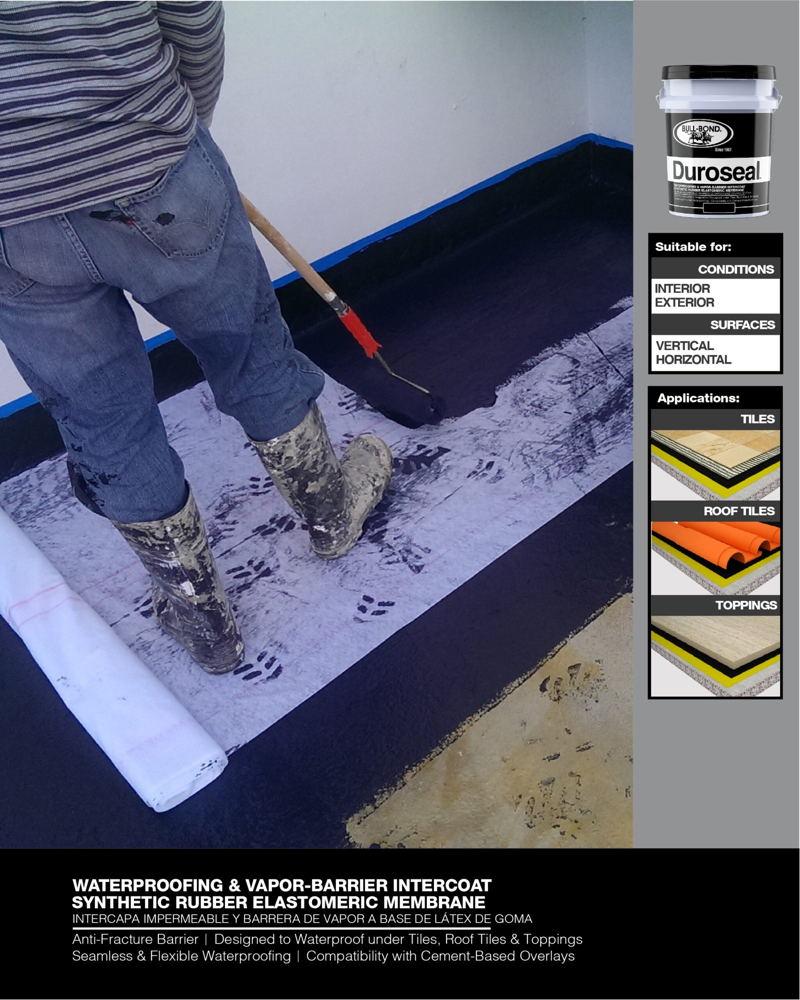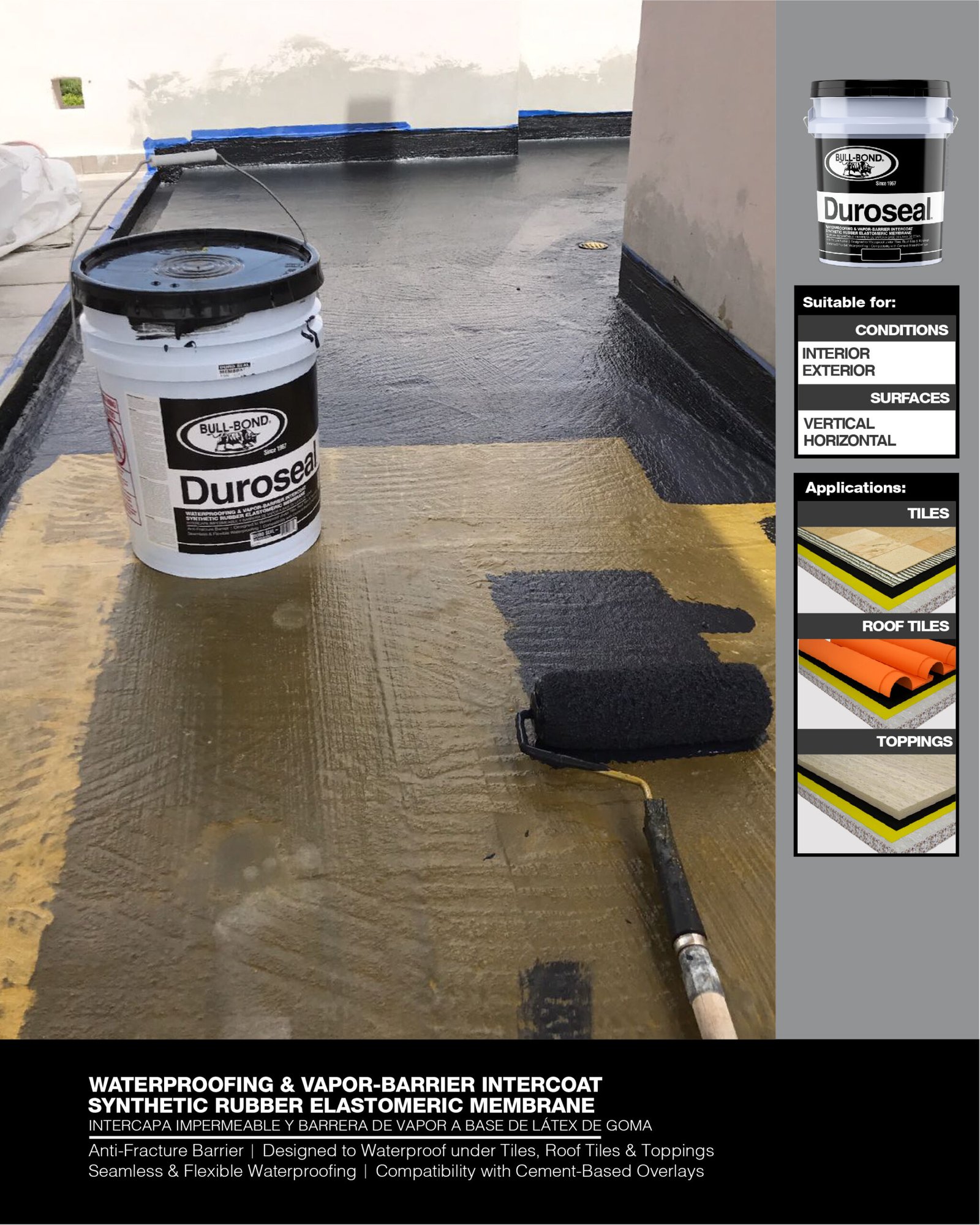 BULL-BOND® DUROSEAL™ es una membrana negra a base de goma sintética, utilizada como sellador de inter-capa. Formulado para sellar, impermeabilizar y hacer barrera contra-vapor bajo losa en pisos, baños, terrazas y cocinas. También se puede utilizar bajo tejas de techo estilo españolas, losas, cerámica y concreto en techos, tanques y estructuras bajo tierra.