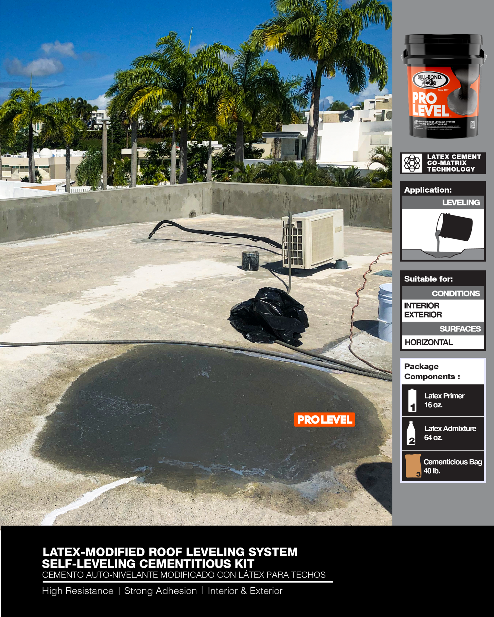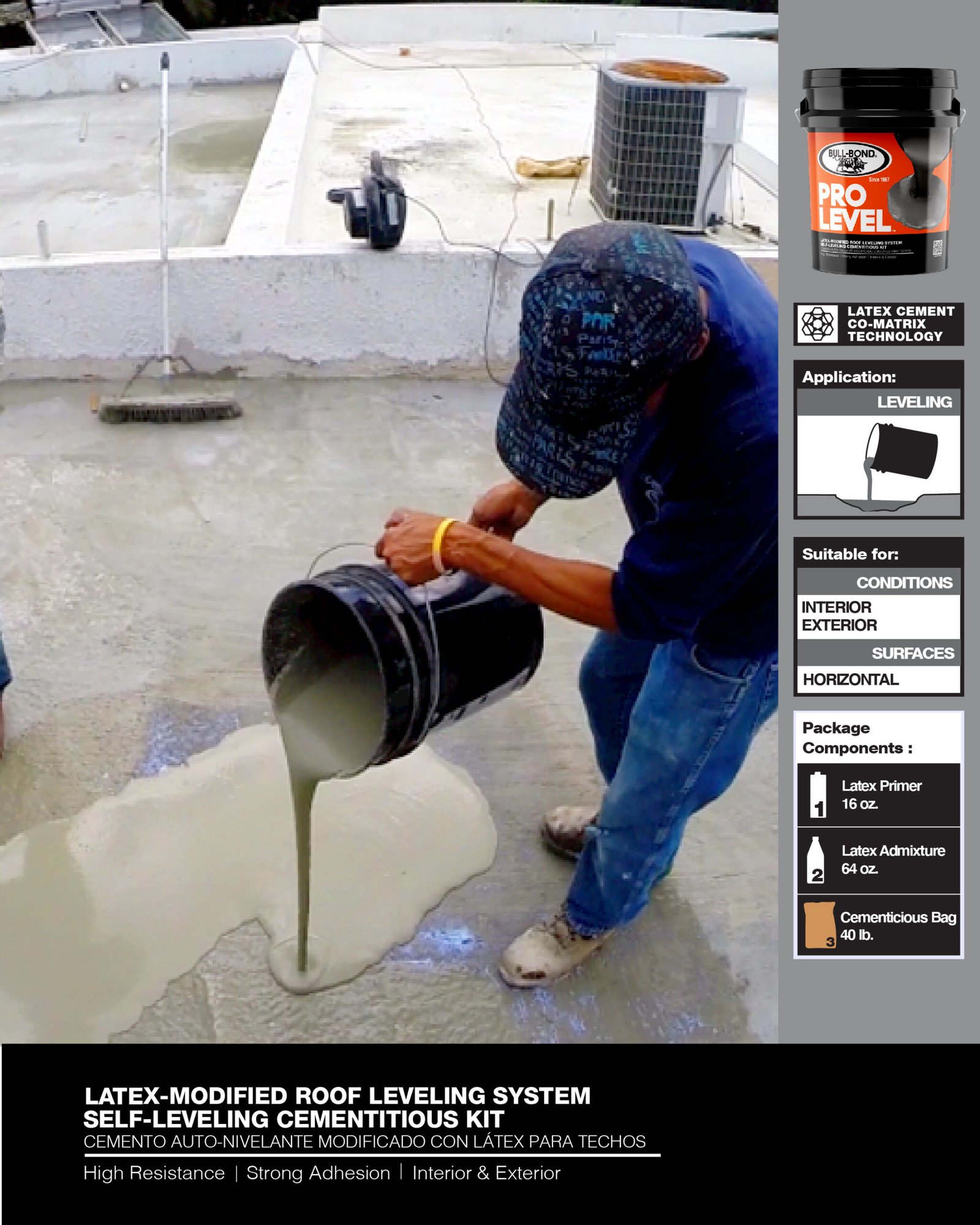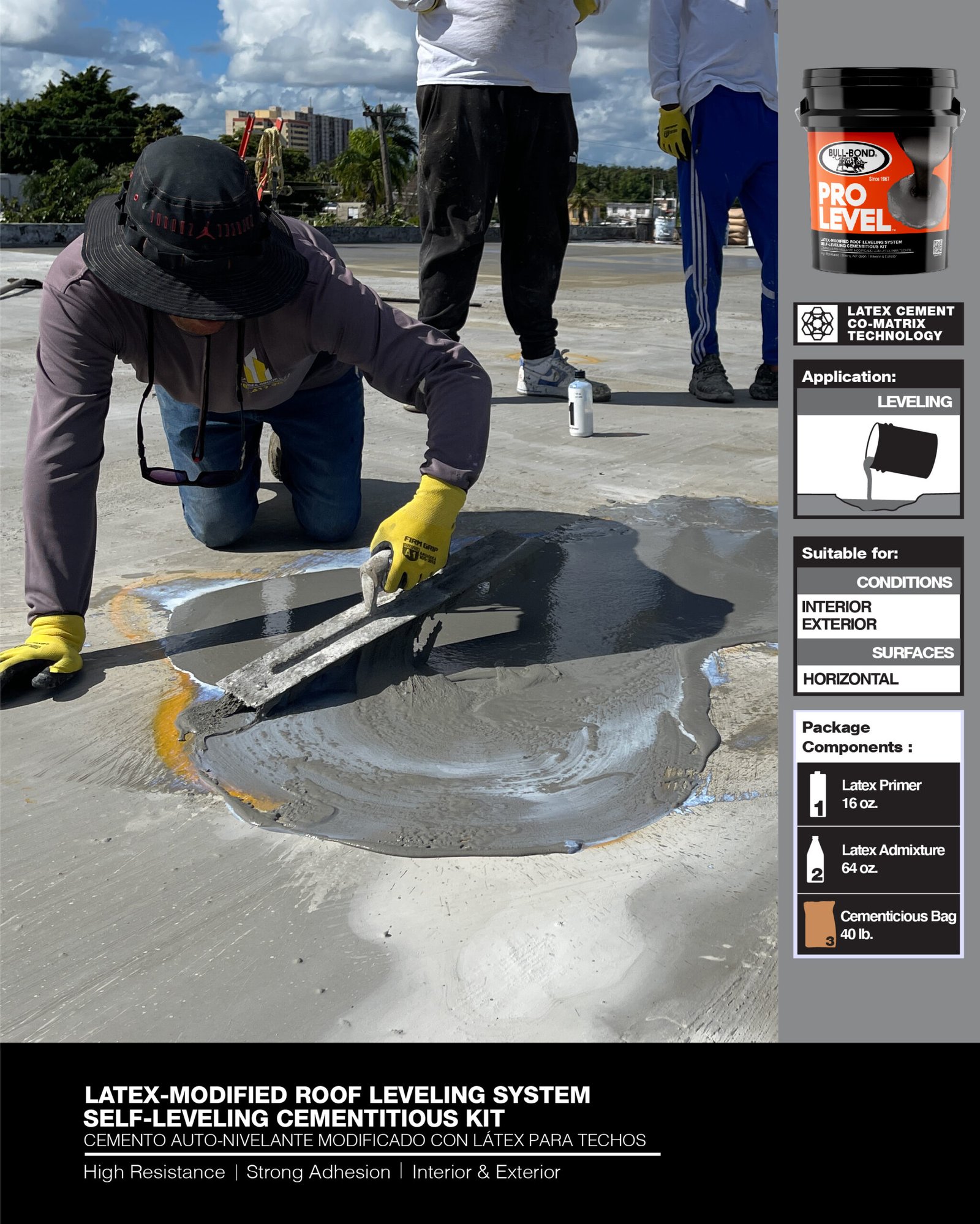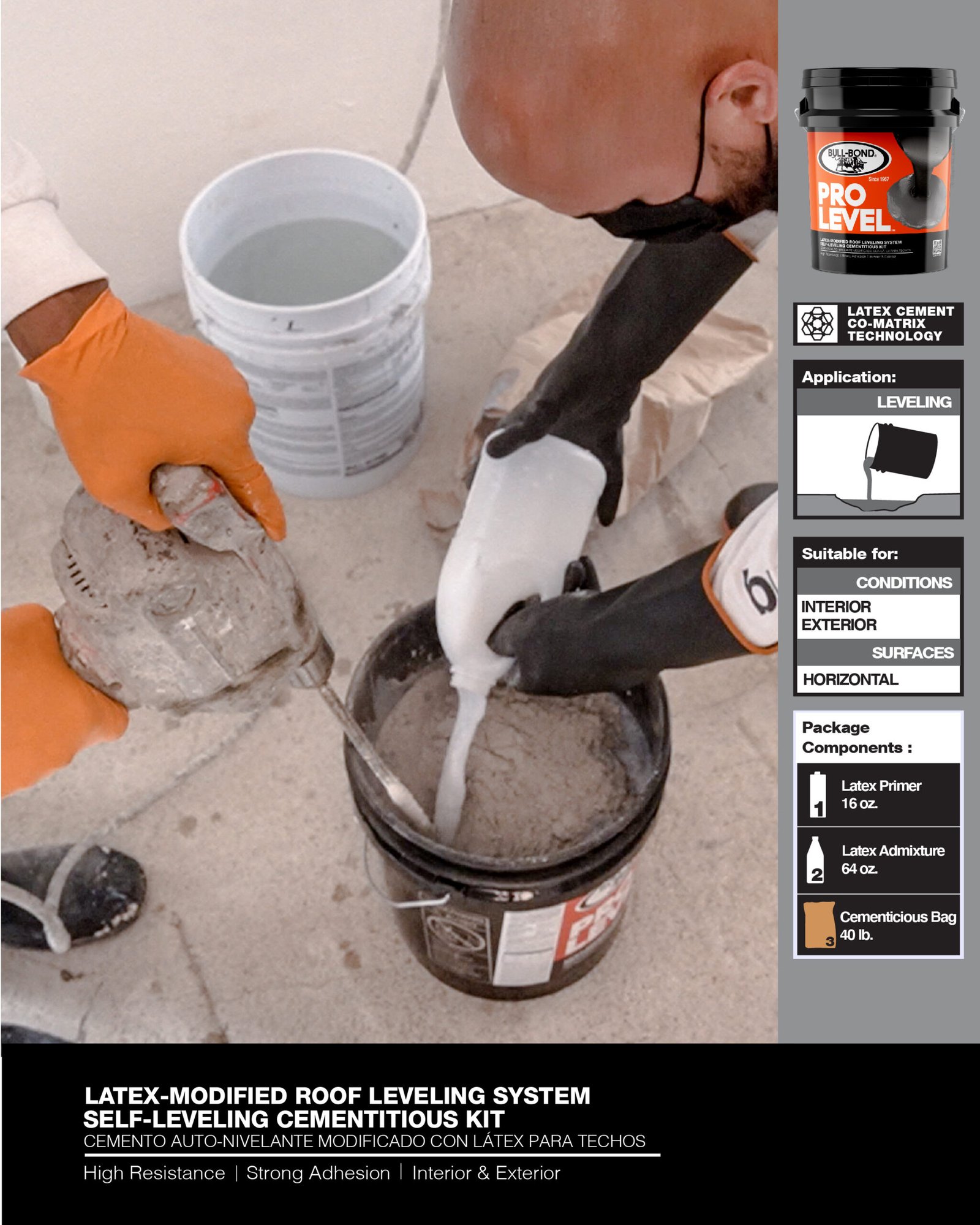 BULL-BOND® PRO LEVEL™ is a latex-modified, self-leveling, high-resistance roof overlay system designed to correct water ponding issues on concrete roofs and to repair irregular substrates prior to the installation of waterproofing systems.
