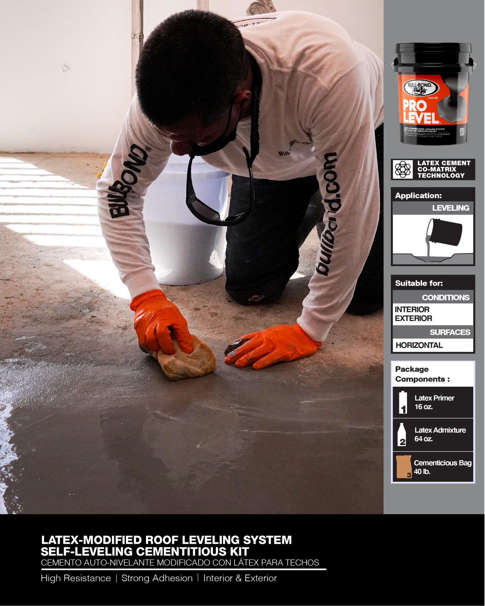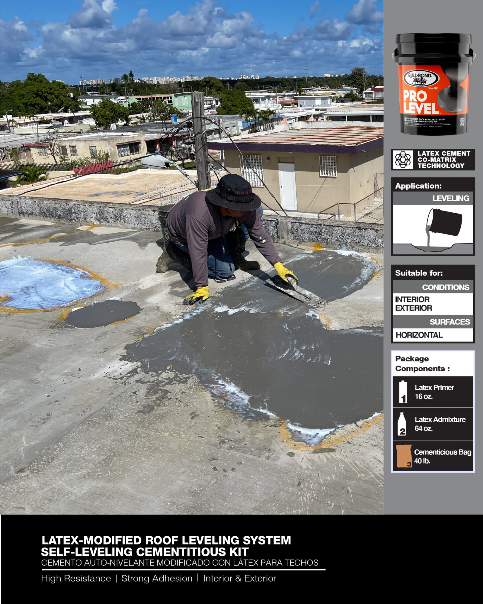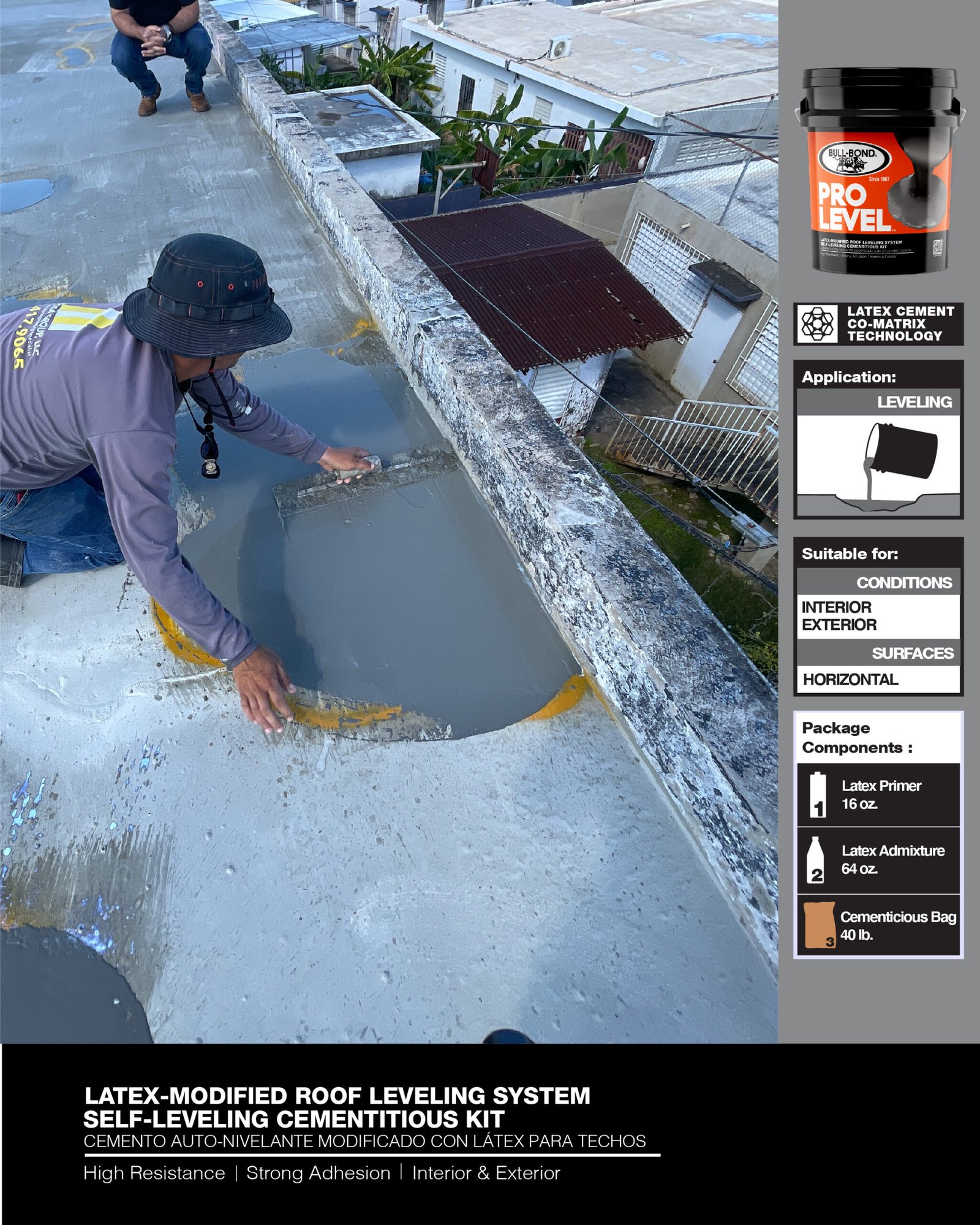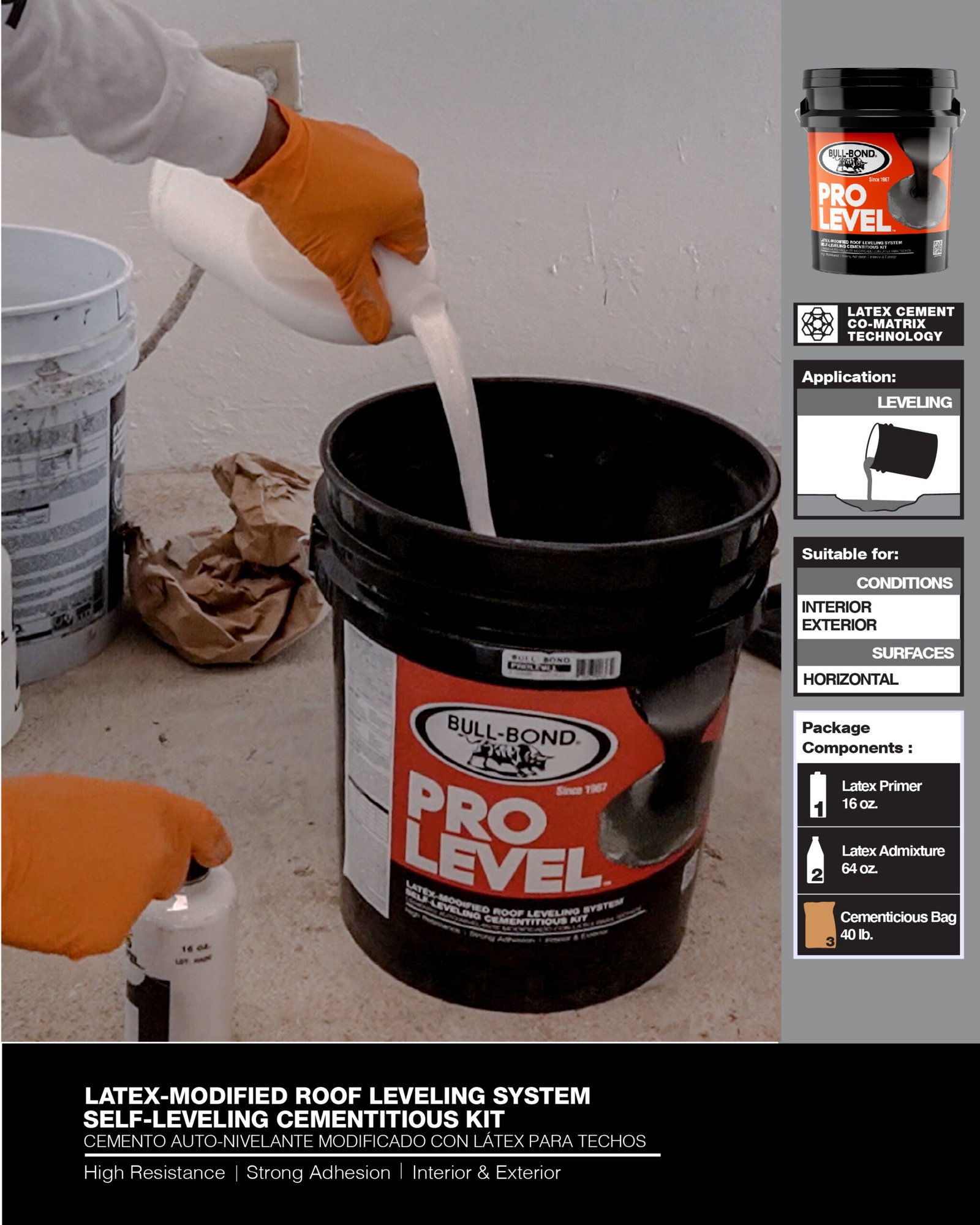 BULL-BOND® PRO LEVEL™ is a latex-modified, self-leveling, high-resistance roof overlay system designed to correct water ponding issues on concrete roofs and to repair irregular substrates prior to the installation of waterproofing systems.