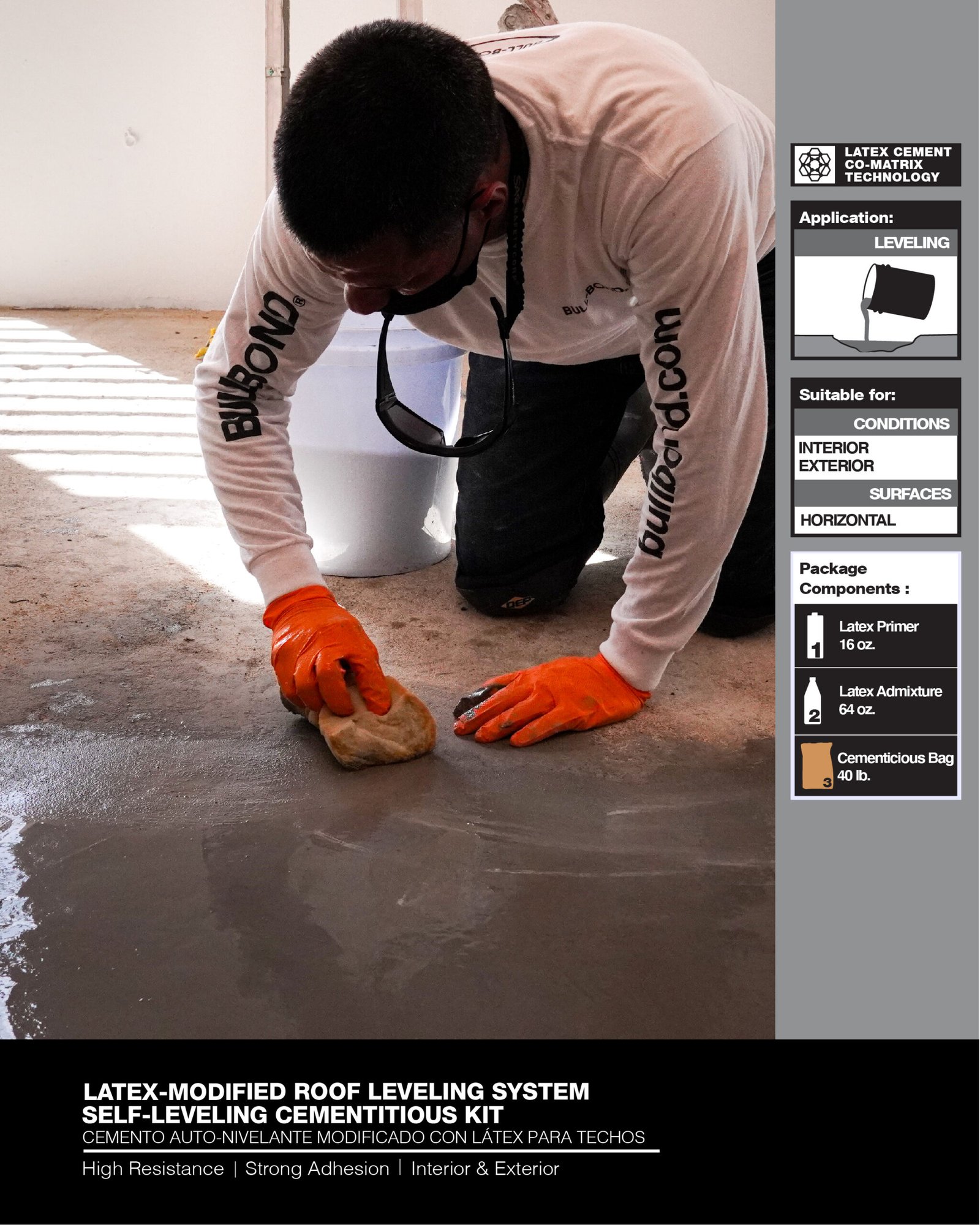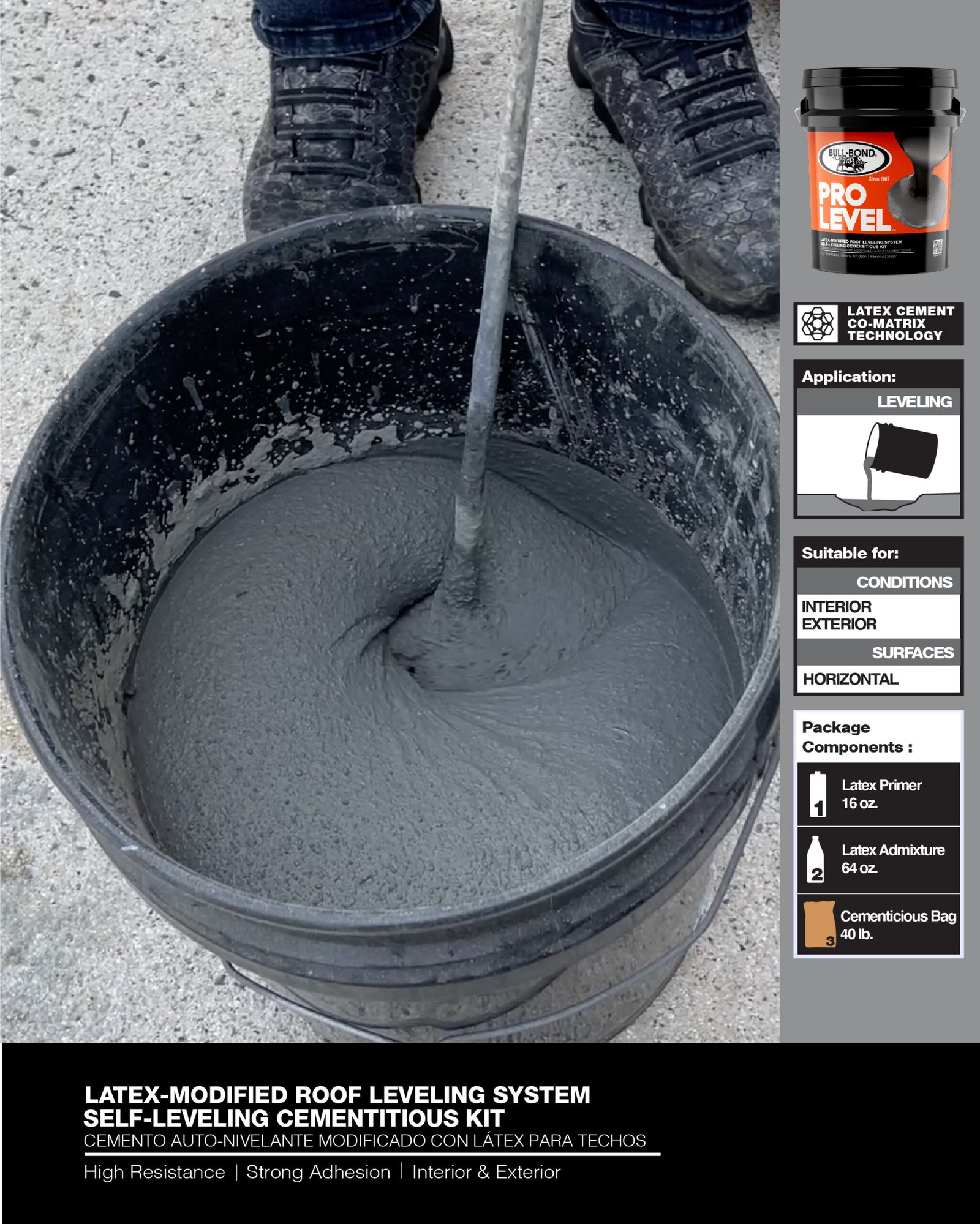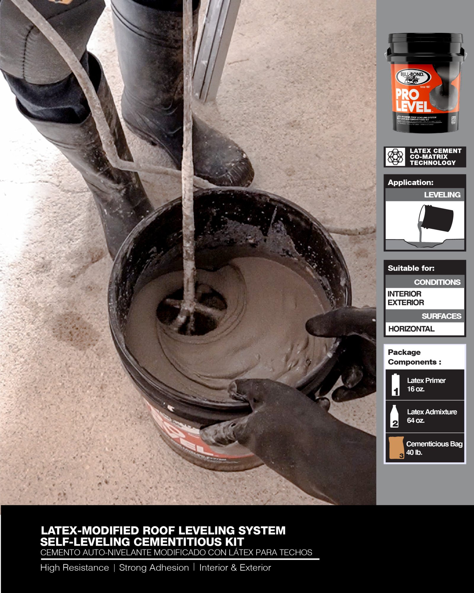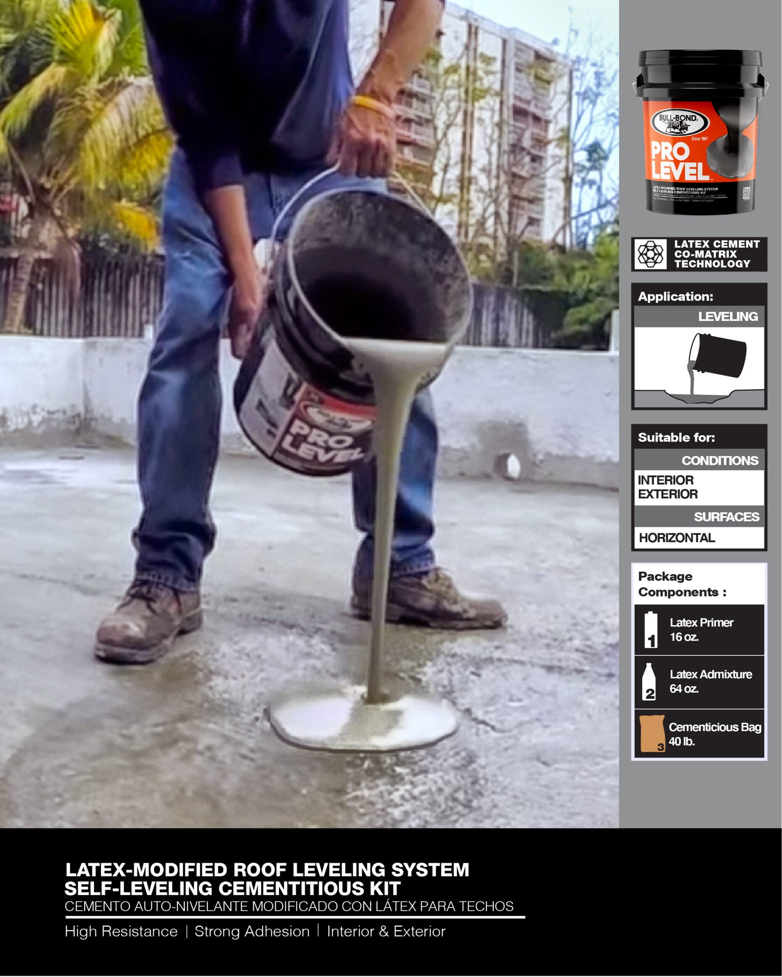 BULL-BOND® PRO LEVEL™ is a latex-modified, self-leveling, high-resistance roof overlay system designed to correct water ponding issues on concrete roofs and to repair irregular substrates prior to the installation of waterproofing systems.