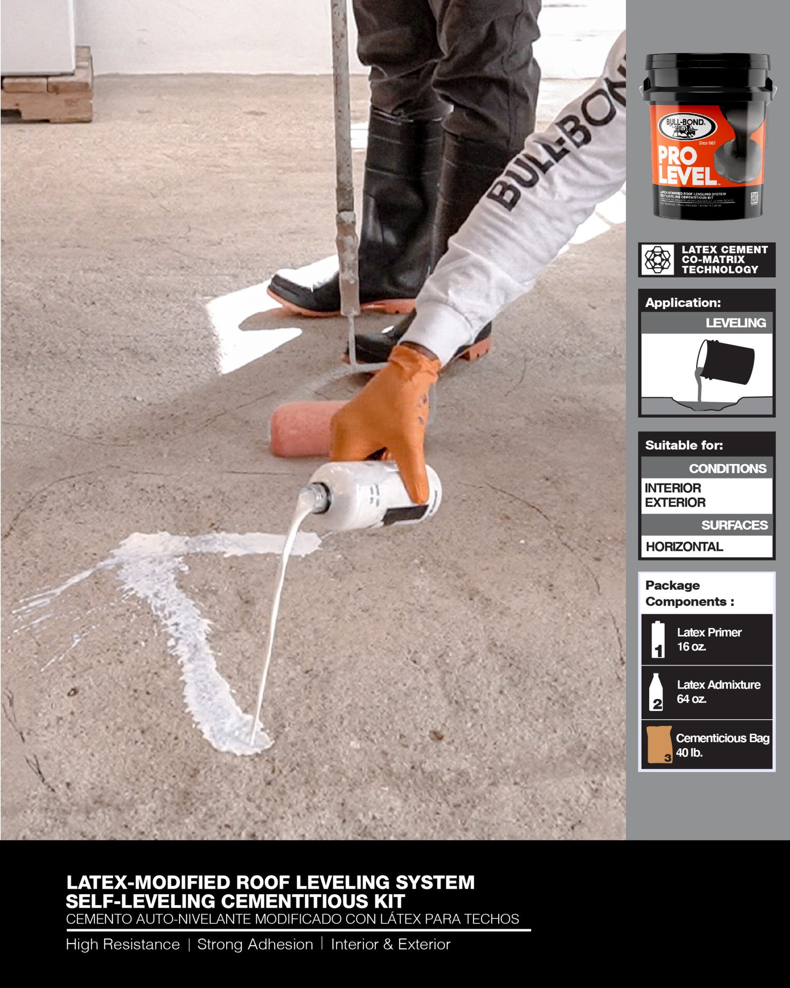 BULL-BOND® PRO LEVEL™ es un sistema de reparación en tres partes formulado con látex, diseñado para ser autonivelante y altamente resistente. Sus propiedades lo hacen ideal para corregir problemas de empozamiento de agua en techos de concreto y para corregir superficies irregulares antes de la instalación de sistemas de impermeabilización.