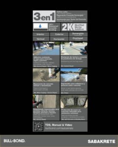 BULL-BOND® SABAKRETE™ es una solución líquida de goma sintética no re-emulsificable y altamente resistente al agua. Formulado con látex y a base de agua, se añade a morteros de reparación para alcanzar una unión permanente a superficies de concreto y mejorar las propiedades de la mezcla de cemento y su curado. SABAKRETE™ es ideal para nivelar techos de concreto, crear pendientes auxiliares para mejorar el drenaje de una superficie, resanar superficies, mezclas fluidas adhesivas (“micro toppings”), reparación de concreto estructural y para crear un sellado impermeable para empañetar superficies de concreto sumergidas. También sirve como un adhesivo no-remulsificable para adherir mezclas cementicias a superficies de concreto existentes, en especial superficies con exposición frecuente al agua o en el exterior de estructuras. SABAKRETE™ es un producto concentrado y debe ser diluido en agua previo a uso.