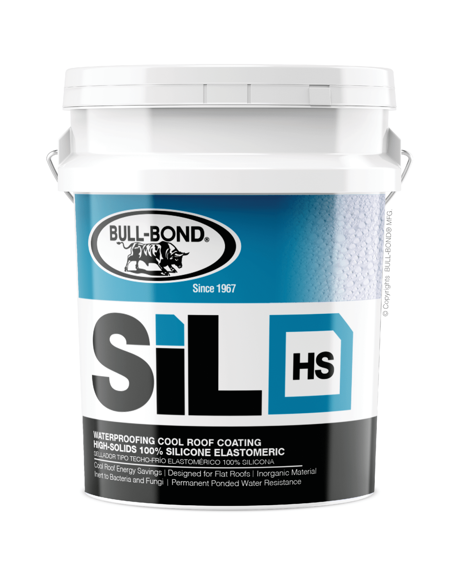 Bull-Bond® SIL HS™ is a High Solids (HS), 100% silicone rubber, solvent-free, single-component, moisture-cured elastomeric liquid roof coating. It cures to form a highly elastic, impermeable, and monolithic silicone membrane that protects and waterproofs roofs in tropical climates.