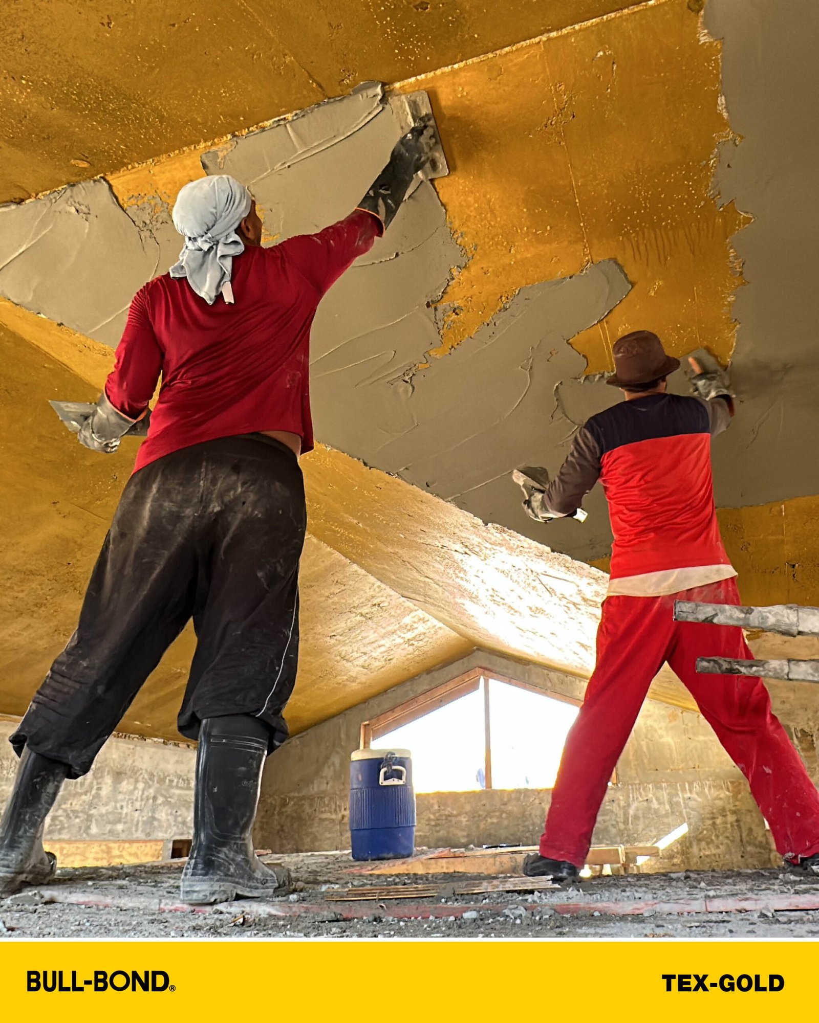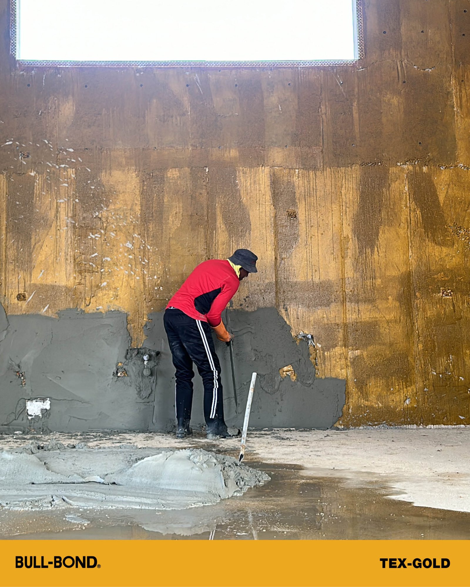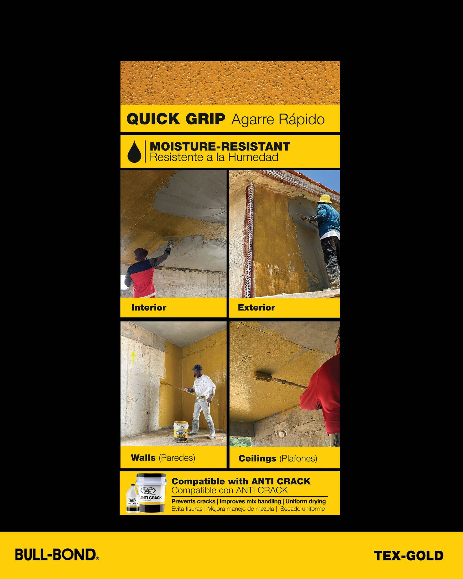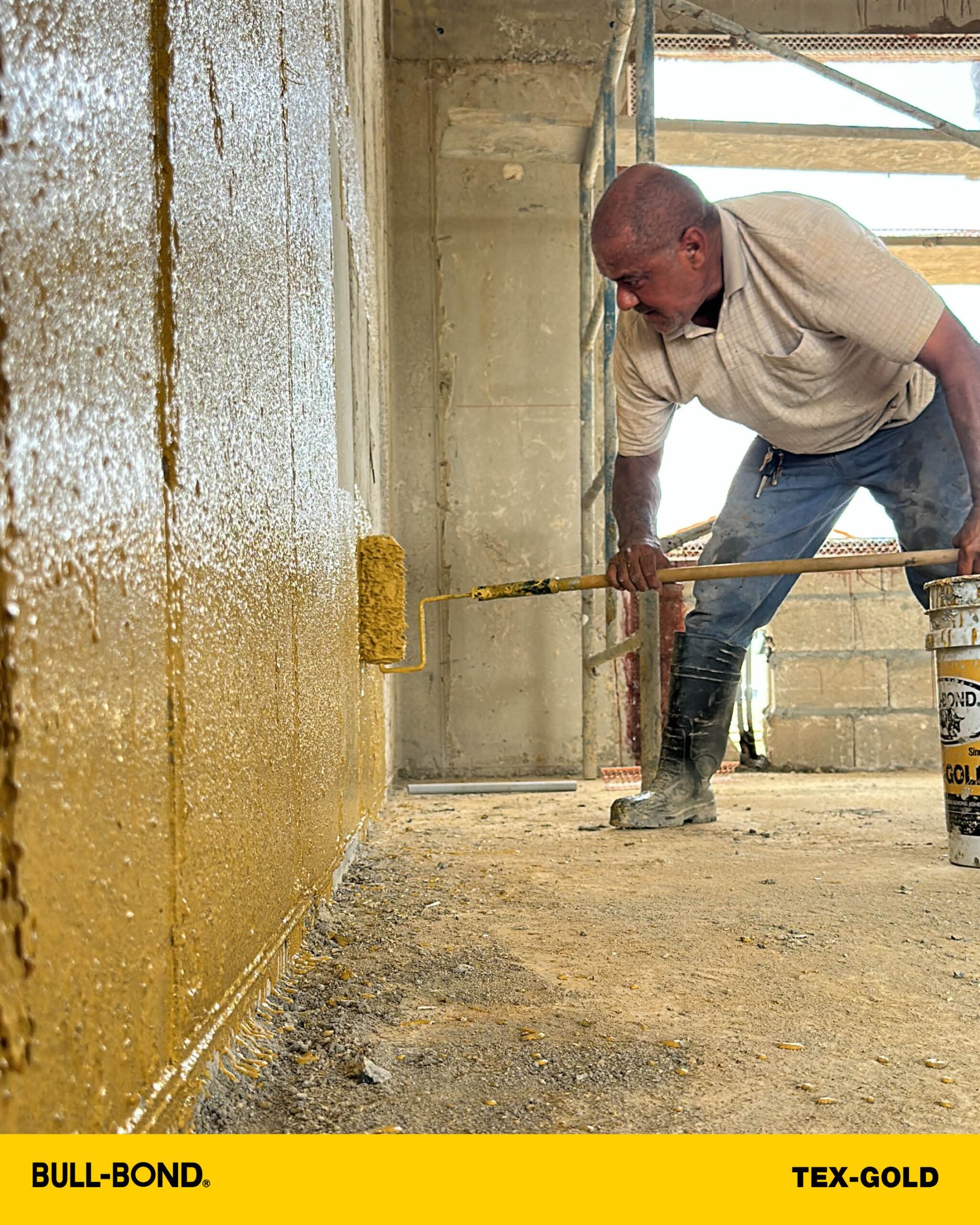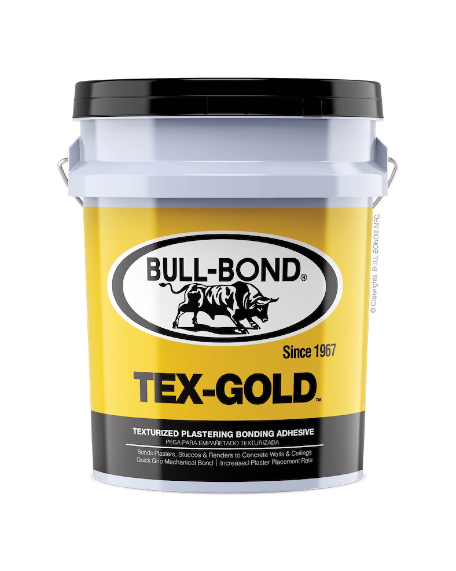 BULL-BOND® TEX-GOLD™ es una pega para empañetado a base de látex con un acabado texturizado y con resistencia a humedad intermitente. Este producto a base de agua se utiliza para proporcionar un medio adhesivo, lo que prepara a los substratos de hormigón para la aplicación de empañetado y estuco sobre superficies de hormigón existentes. Su terminado es texturizado y provee rápida adhesión mecánica para el mortero de empañetado. TEX-GOLD™ produce una lámina de pegamento resistente al agua sin perder sus propiedades adhesivas en comparación a otros adhesivos re-emulsificables. Ideal para superficies horizontales (techos) interiores y superficies verticales (paredes) en interior y exterior.